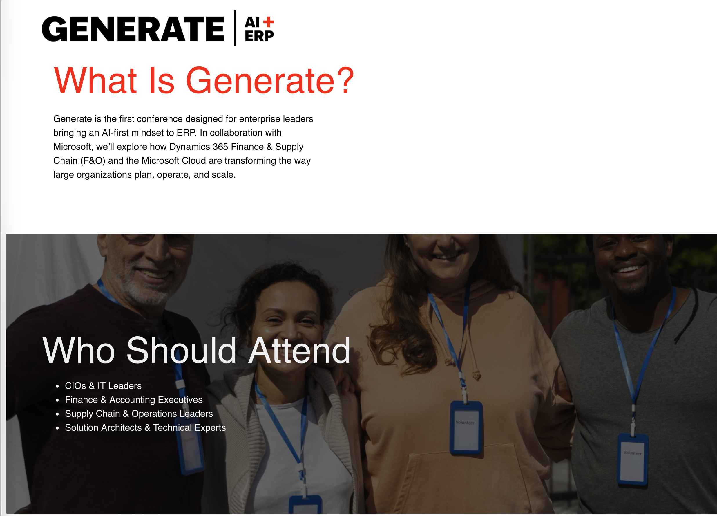 According to the website, Generate is the first conference designed for enterprise leaders bringing an AI-first mindset to ERP, and in collaboration with Microsoft, it will explore how Dynamics 365 Finance & Supply Chain (F&O) and the Microsoft Cloud are transforming the way large organizations plan, operate, and scale.